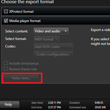Smart Client does not support the use of video text when doing MKV export. (Only AVI export does.)