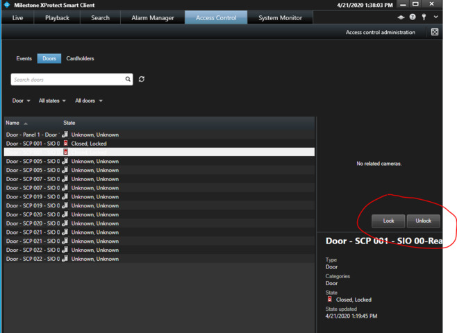 Hi, in the Access Control plugin is it possible to add additional door commands? The demo plugin has Lock and Unlock. If so how can that be done? I have tried adding commands to the CommandTypes class in Types.cs but I still only get Lock and Unlock buttons in the XProtect smart client. Screenshot below. An example of an additional command is “Allow users to enter PIN only”.