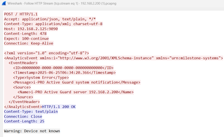 In 2025R2, when our software sends Analytics event, XProtect responds “Warning: Device not known”.
