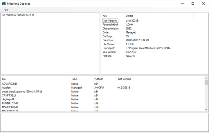 Hi, we are migrating our C# Windows application to 64-bit and we are having some conflicts when using the Milestone SDK. I downloaded the latest version and since I couldn’t find anything specific for 64-bit I assume it would work, but still doesn’t. I checked the details for the dlls in the package with a tool called pstudio and it returns it has been compiled on 32-bit (check attached image for Videos.platform.sdk.dll)