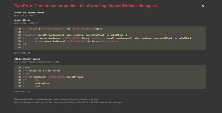 Okay, I will try to make it as straightforward as possible, I get this error when connected with connection ID after I click on the camera to start the video. Also, I should mention that I am using Typescript and all of the XPMobileSDK files are in the public folder outside of the bundled code. And I am using MIPSDKMobile_2019R2. If I use login and not connectionId, everything works fine.