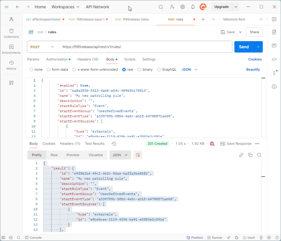 In order to show you how it can be done I cheated a little. I create a new rule in the Management Client. I read it using the RESTful API doing a GET. I copy the output. I do a POST instead, I use the copied JSON as body in the POST request but change the name and the id. Doing this the POST will make a new rule for me.