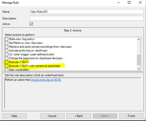 2, It is possible to configure Recurring time as start action and select Execute BAT as action to perform on Management Client. Please see below picture.