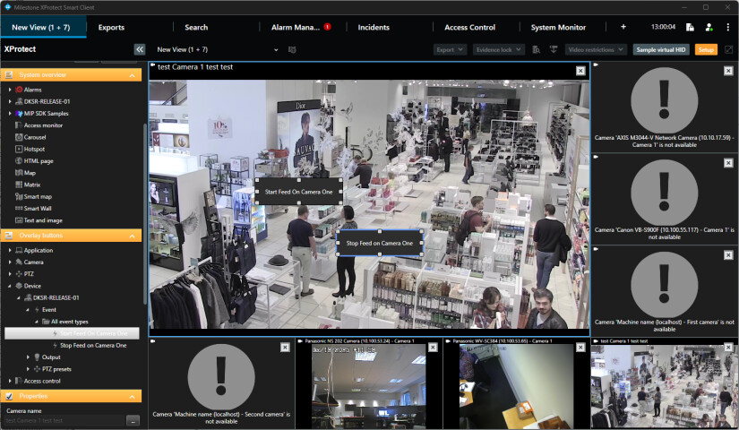 If you have this rule and these user–defined events in place you can in the Smart Client, in setup mode, create a overlay button by dragging the event onto the camera view, like this: