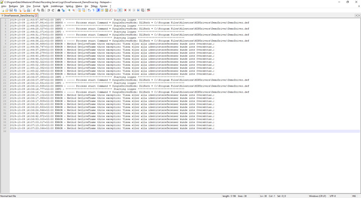 2019-10-09 11:44:28.027+02:00 DEBUG - ----- Process start Command = SingleDriverMode; DllPath = C:\Program Files\Milestone\MIPDrivers\DemoDriver\DemoDriver.def