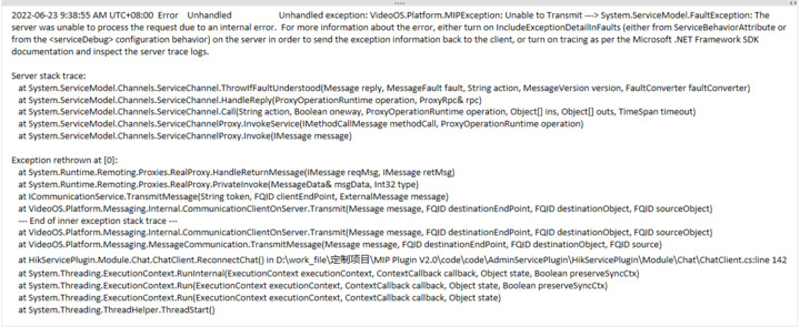So, I judged that MessageCommunication may have a Token timeout mechanism, so I thought of reconnection. When the plugin detects that MessageCommunication cannot send messages normally, I will stop the previous MessageCommunication and start a new one. The reconnection mechanism is shown in the attached code. As a result, when I judge that the connection status is available, I call TransmitMessage again, which causes the event server to crash and restart. The crash log is shown in the attachment.