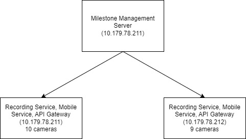 One master server (10.179.78.211) setup : Management Server, Recording Server (10 cameras), Mobile Server, API gateway and another (10.179.78.212) : Recording Server (9 cameras), Mobile Server, API gateway.I use SOAP service : http://10.179.78.211/ServerAPI/ServerCommandService.asmx?WSDL