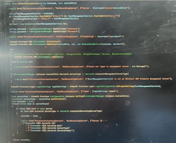 [LogLib.Info](https://LogLib.Info)("MilestoneInterfaceService", "GetRecordingServer", $"Server ID : "