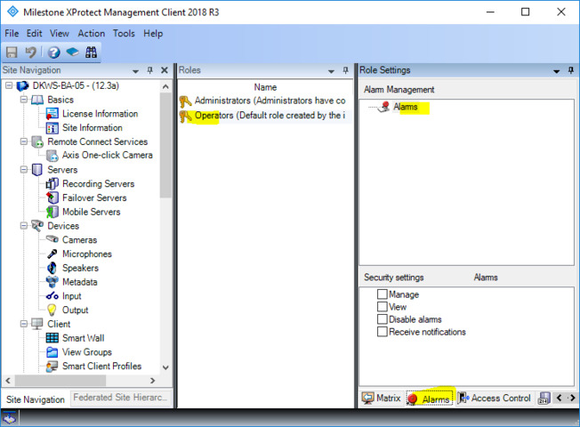 When working with alarms please use the flags on the Security Settings for Alarms, this is the recommended way. This will ensure the right handling even in systems where there is administrators that can administrate sub-systems without belonging to the administrators role.