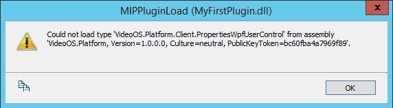 Error Message : Could not load type ‘videoOS.Platform.Client.PropertiesWpfUserControl’ from assembly ‘videoOS.Pltform,Version=1.0.0.0,Culture=neutral,publicKeyToken=bc60fba4a796f89’