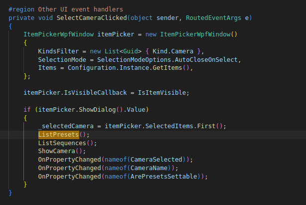 The sample is using the ItemPickerWpfWindow to let the user pick one camera.
