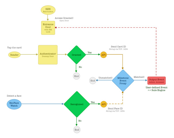 Please see the attached diagram. I am trying to achieve 2FA to unlock the door using NEC’s Neo Face. Their software can send the GUID as a stream to milestone proxy. However, the access point (reader) side cannot do so.