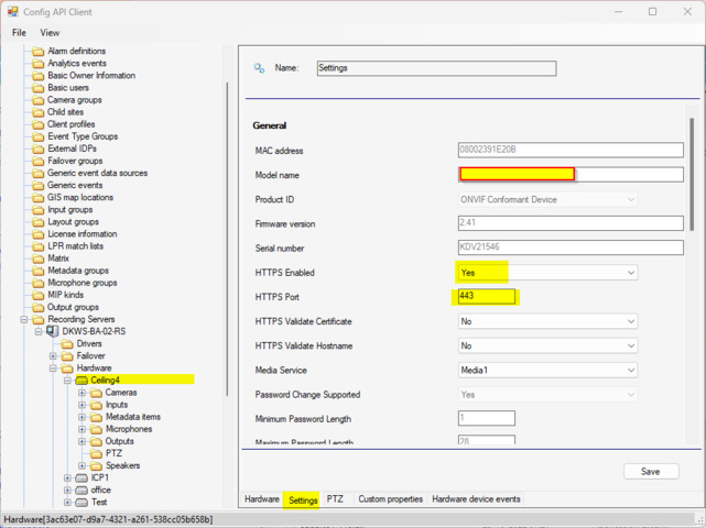 What you get is the base address of the hardware. If the property HttpSEnabled exists in the general settings of this hardware and has the value Yes, the address should be modified to use HTTPS and the port defined in the property named HttpSPort under general settings. (The Management Client does this behind the scenes.)