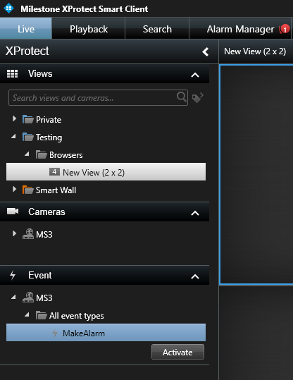 The easiest way is to activate it in Smart Client. Here’s a screenshot showing a user-defined event named “MakeAlarm” which can be activated within Smart Client and you can see it created an alarm (see the Alarm Manager tab)