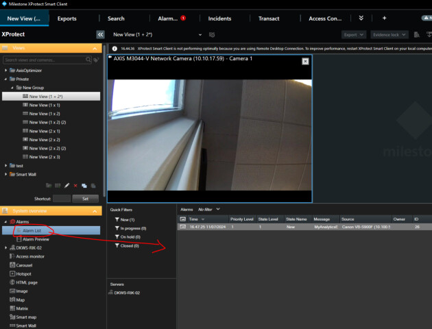 Select the Alarm List in the viewitem and go to properties. Select Event. If you want to see Alarm list, please select Alarm. Escape from Setup mode.Then you will see all the events in Live view.