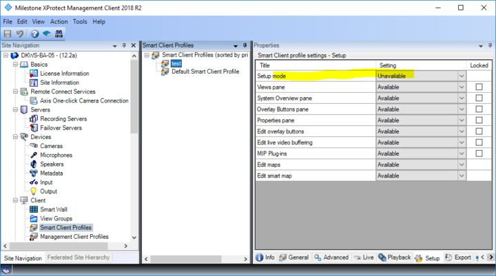 You can configure the system so that Setup mode is not available to the user, by modifying the Smart Client profile of the role the user belongs to.