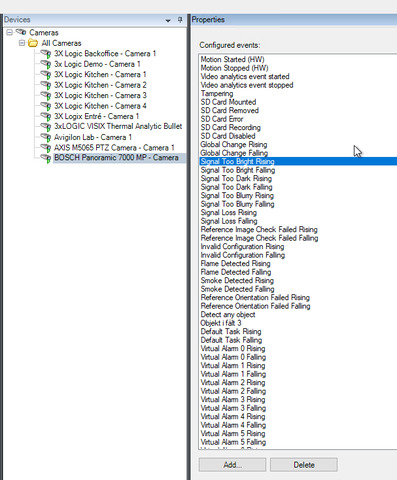 I have found a test camera. I do see a lot of the events. It might be a coincidence you are on “Signal Too Bright Rising” but I used that one for my investigation and I found it with a slightly changed name: “6-18-3-Signal Too Bright-0”.