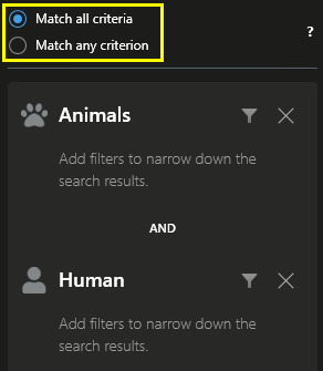 First a general comment. The SCAnimalsSearchAgent is a sample illustrating which options you have when creating a search agent, and the results produced by it are not in any way related to the video in the VMS. This may cause some confusion when combination logic is involved; see below.