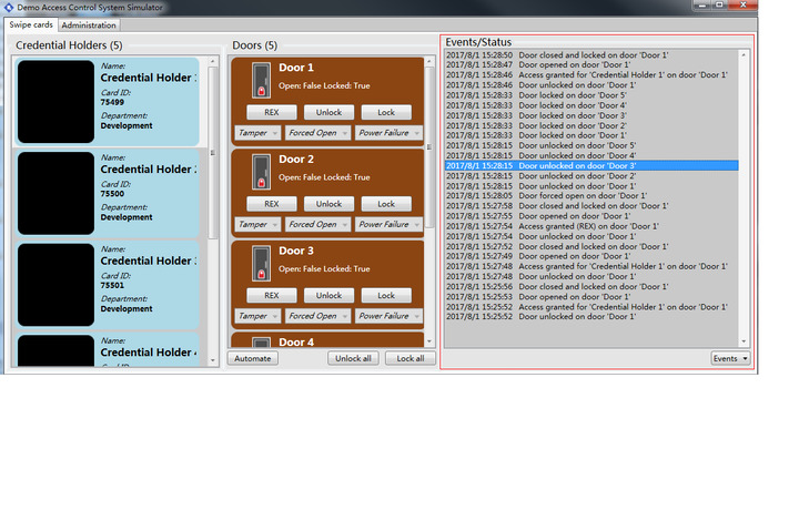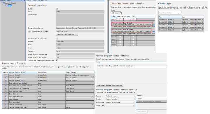 I have run the Demo Access Control System Simulator and also the DemoAccessControlPlugin, but I can’t see any event on the Smart Client.I attached some pictures show my operation.please tell me what should I do,then I can see the events and Lock/Unlock the door on the Smart Client.Thank you.