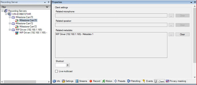 Hi Peter, As shown in the attached screenshot (Config.png), we are creating a single MIP driver listening on port 52124 and attaching this with two cameras namely Milestone cam 70 and Milestone cam 72. So with this configuration, if we write the metadata using Metadata provider, it is writing the bounding box on both the cameras. Kindly let us know how to avoid bounding box displayed on both the cameras