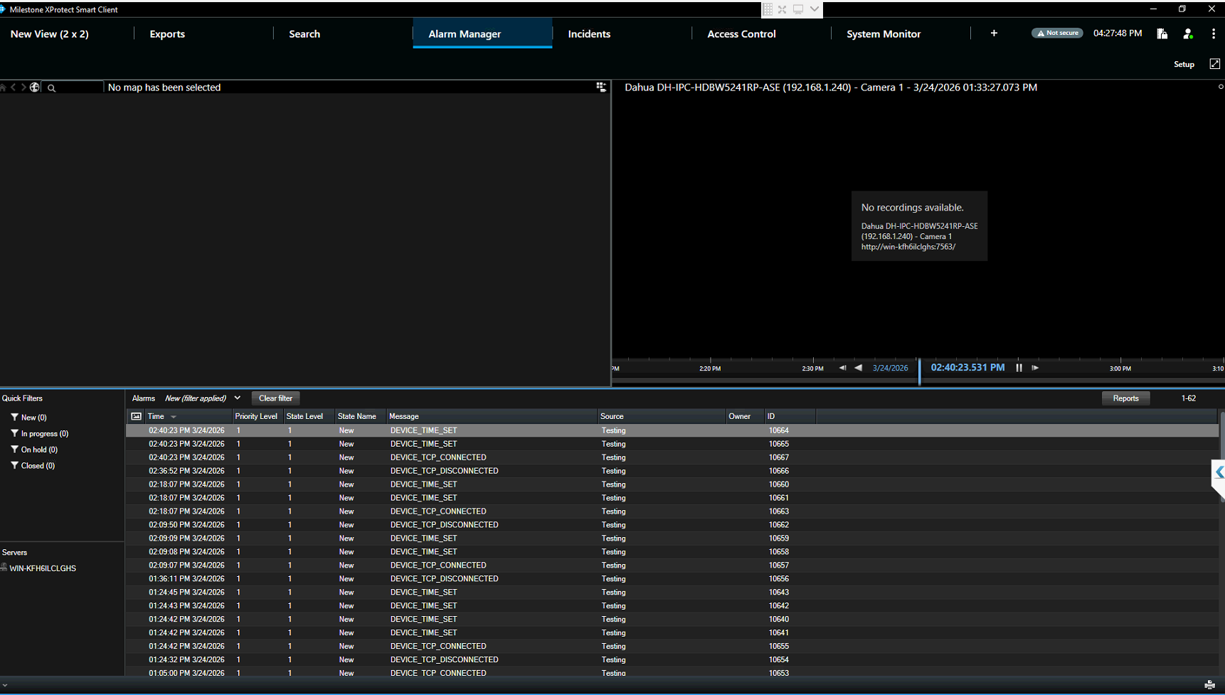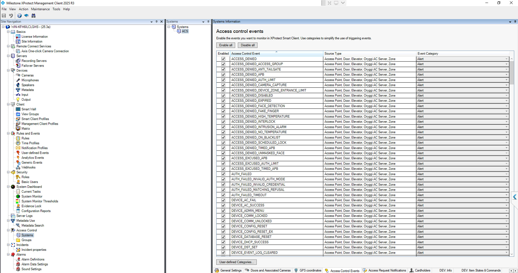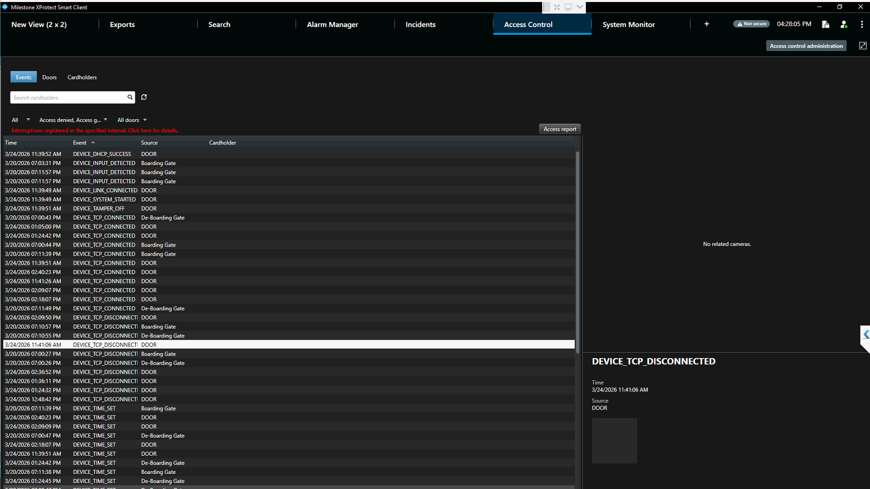the Access Control Events tab and Alarm Manager — but only when I switch tabs. They do not appear in real-time.