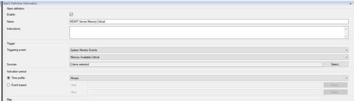 Alarm definition shows event as Memory available critical