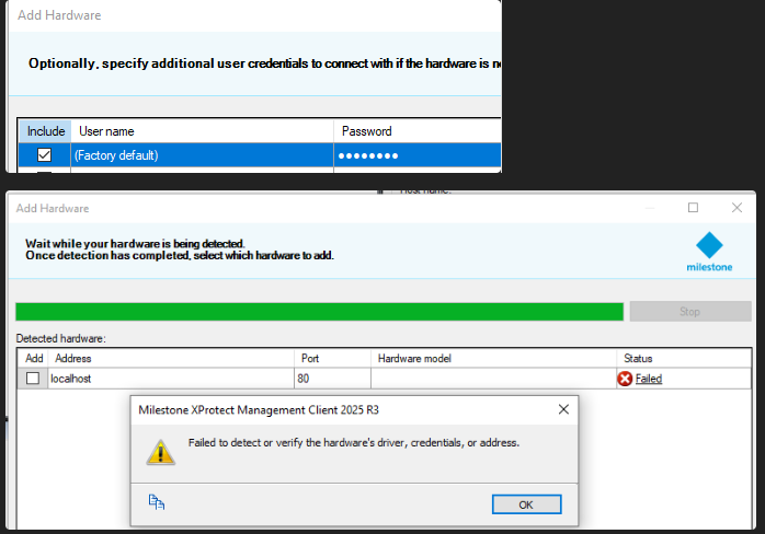 When I add a new device and leave “Use factory default credentials” checked, I get an unauthorized response (or the error shown in the screenshot). However, if I enter any other username/password combination, it works.