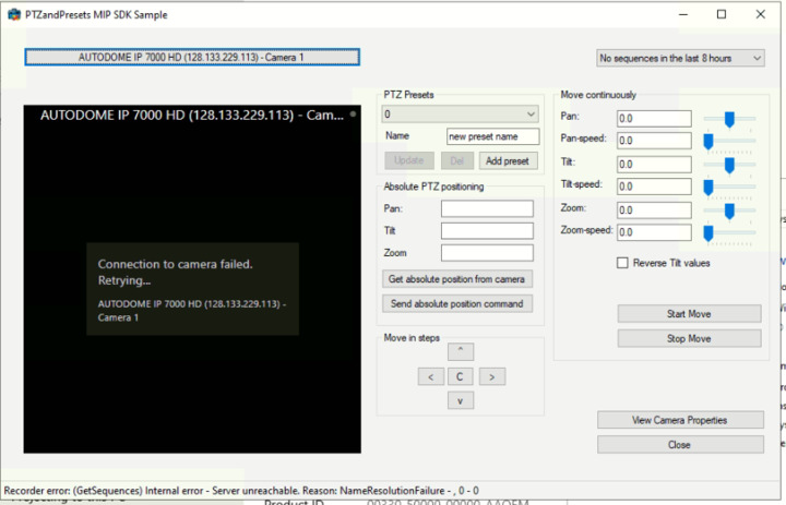 I have run two instances of the PTZandPreset sample (build and run, unmodified) in two different workstations, both are able to login to the Milestone Server using basic authentication, one of them is able to retrieved camera feed and control PTZ without any problem, while the other failed to retrieved camera feed with showing the error: “Recorder error: (GetSequences) Internal error - Server unreachable. Reason: NameResolutionFailure -, 0 -0” as shown in the following picture: