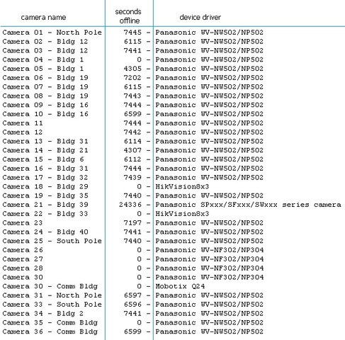 Note that all of the cameras not responding are Panasonic. However, the camera using Panasonic SPxxx/SFxxx/SWxxx has been not responding significantly longer than the cameras using WV-NW502/NP502.
