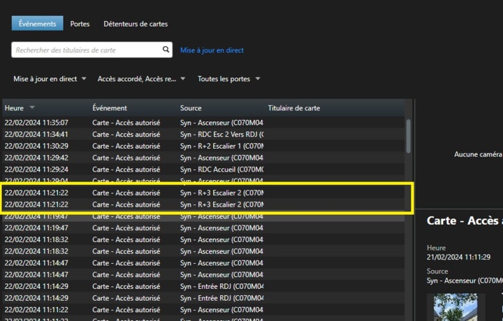 But then, on the events displayed in the Smart Client interface, the same event seems to appear twice: (I redacted out the names of the users of the system appearing in the access control events).