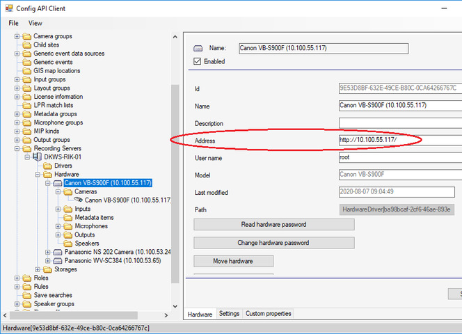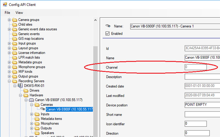 First, please start Config API Client sample. Click Recording Servers – Hardware – (your target hardware), then you will be able to see Address. Also click Cameras - (your target camera) then you will see channel.