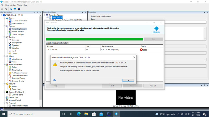 At the initial stage, we need the list of prerequisites to onboard our ONVIF device in the management client. Also we are trying to add our device in recording server. But it got failed in between as per attached image.