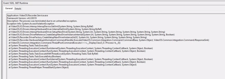 I’ll attach the logs to this. Also, I noticed in the Windows Event Viewer this error every time we tried the Replace Hardware SDK call. I believe we were attempting to change from 81 to 94 channels at the time we received the first error. (We had been adding channels, usually around 16 at a time, up until then just fine). In the more recent entries in the log, I had tried deleting the hardware device from the recording server and re-adding the hardware, but the effect seemed to be the same (“no response from recording server”)