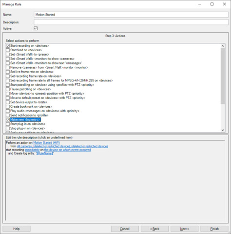 You will never see the event in server log if you don’t select “Make ne” in the rule as shown on the screen shot . If you do it as shown in logs you will see the name of the rule(Motion Started in this case) not the name of the event. You can configure to see the name of the event if you want.
