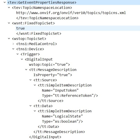 At first glance I don’t see anything wrong with GetEventProperties response that you sent. But we use the response only to get the list of events the device supports. As explained in documentation we check which of the events from the list is already supported and add as dynamic events only the rest of the events. There are also some limitation described. Then, when we receive the real event trough PullMessagesRespose we are trying to match with the description from GetEventProperties. There could be same differences that are preventing us from matching the event. To be able to help you we will need Wireshark trace. Start Wireshark capture, add the device in XProtect, configure event, activate the event on device then stop Wireshark capture save it and send it to us for investigation.