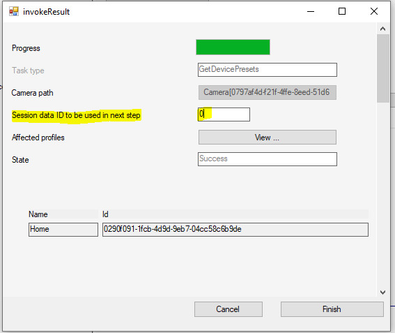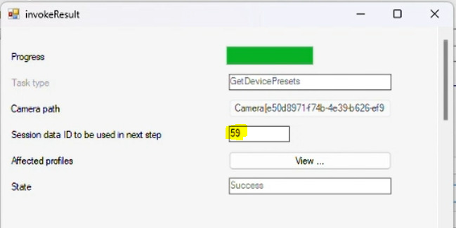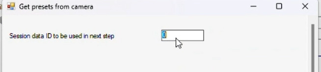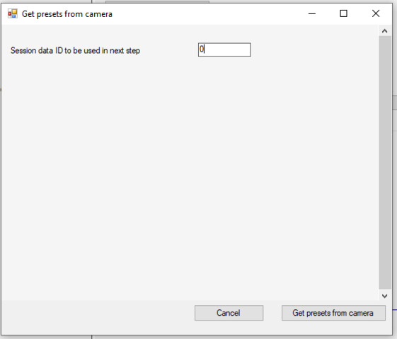 Make sure, that the Session data ID to be used in the next step is set to the same ID as in the first dialog. It seems that those two values don’t get aligned automatically.Once you finish getting presets from the camera in ConfigAPI sample and navigate to the Management Client, you should be able to see the retrieved presets.