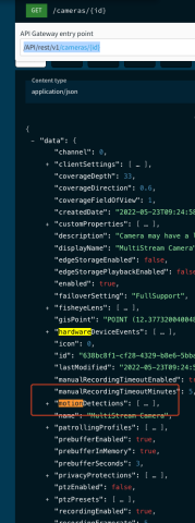 I found an endpoint that - according to the example - should tell me whether the camera is set to record on motion (/API/rest/v1/cameras/{id}). But when I execute the request as shown in the example, I don’t receive the motion field in the response.