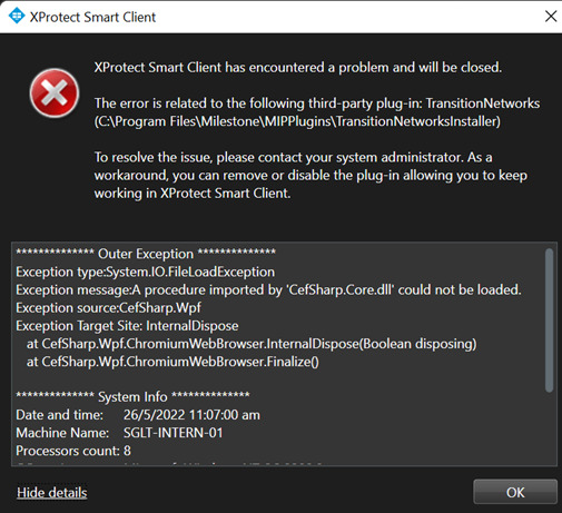 I am currently testing out multiple Smart Client plugins for a project. O-Insight, BioStar2 and TransitionNetwork. When I run each plugin on its own, they are able to function as intended. However, when I run any 2 of the plugins together, there will be an error message.