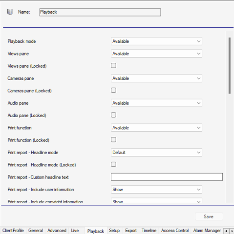 Observation: If I look at the first tab “Client Profile” the Save button is enabled, if I switch to “Playback” modify something, switch back to “Client Profile” and use the Save button, my changes are saved.