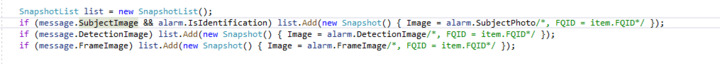 So the image format was correct, the process of the Alarm too, but it seem that FQID value “blocks” the images sended through SnapShotList field, but only in Alarms, not in Analytic Events.
