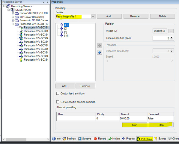 Management Client- Go to camera and select patrolling tab. You will see start and stop button.