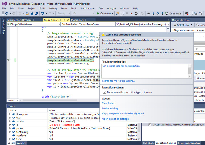 I’m running one of the milestone e-learning examples as “Developing MIP SDK integration” “04-SimpleVideoViewer”.