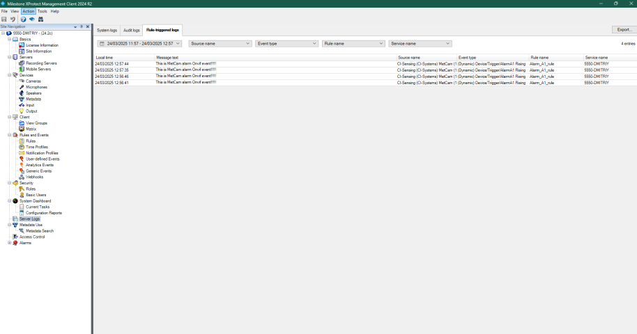When I connect the camera via the Management Client, I can view the RTSP video stream and see the list of events reported through Events → Add. The camera generates ONVIF events every second, and these events are visible in the ONVIF Device Manager (OBD app). However, when I attempt to log these events using Rules → Create log entry, nothing appears in the logs.