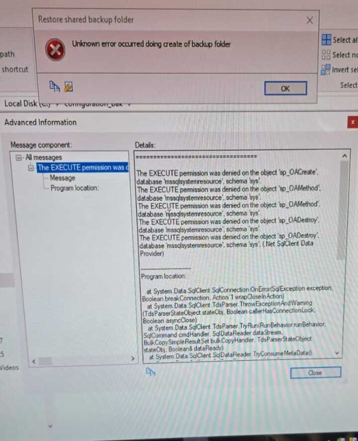 When attempting to create backup configuration file from Milestone Management Client, the system gets stuck at the progress bar for a few seconds before returning us the error in screenshot provided below.