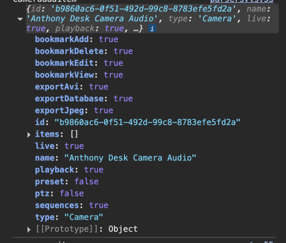 Below is a screenshot of the console log of the camera object, the camera has the capability for audio streaming.
