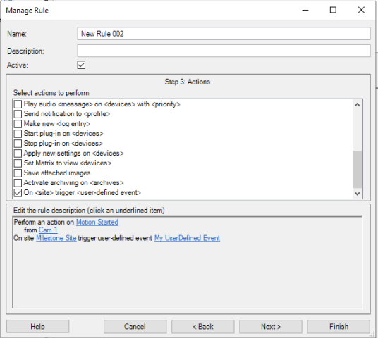 What I’m trying to do is listen to various kinds of system, device etc events (in this case Motion Started) that are triggered against cameras. And by creating a user-defined event this way, make it simpler for the user of the plugin, who can then just create rules like this and customize exactly what events trigger the user-defined event. So a sort of common interface; the plugin will only listen for this user-defined event.