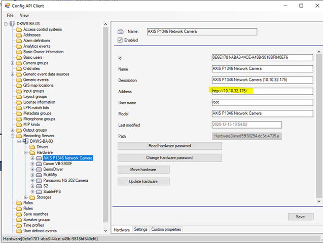 I’m working on the OverlayOnEvent sdk sample. I found the private void UI_DrawOverlay is the portion that actually controls the overlay data. I can see that I am getting the object addOn.CameraName as the source of the overlay data. What I would like to reference is the hardware ip address of the camera so I can use it in a ping of the device. What is the object that references the hardware ip address?