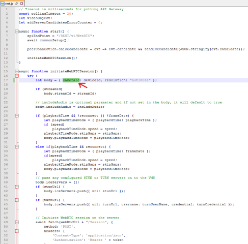 I’ve updated the parameter name from deviceId to cameraId in the initiateWebRTCSession function within the rest.js file. Please see the attached screenshot showing the change I made.