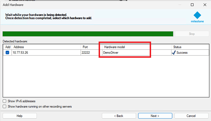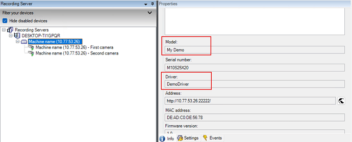 We also tried with demo driver using express discovery, during discovery Hardware model shown as “Demo Driver” in the Milestone discovery window and after demo device addition, the model name is displayed as “My Demo” under Info Tab. Please see below attached images for Demo Device Model Name and Demo Device Discovery snapshot. We also attached ONVIF Discovery snapshot which have correct camera model names displayed in discovery window.